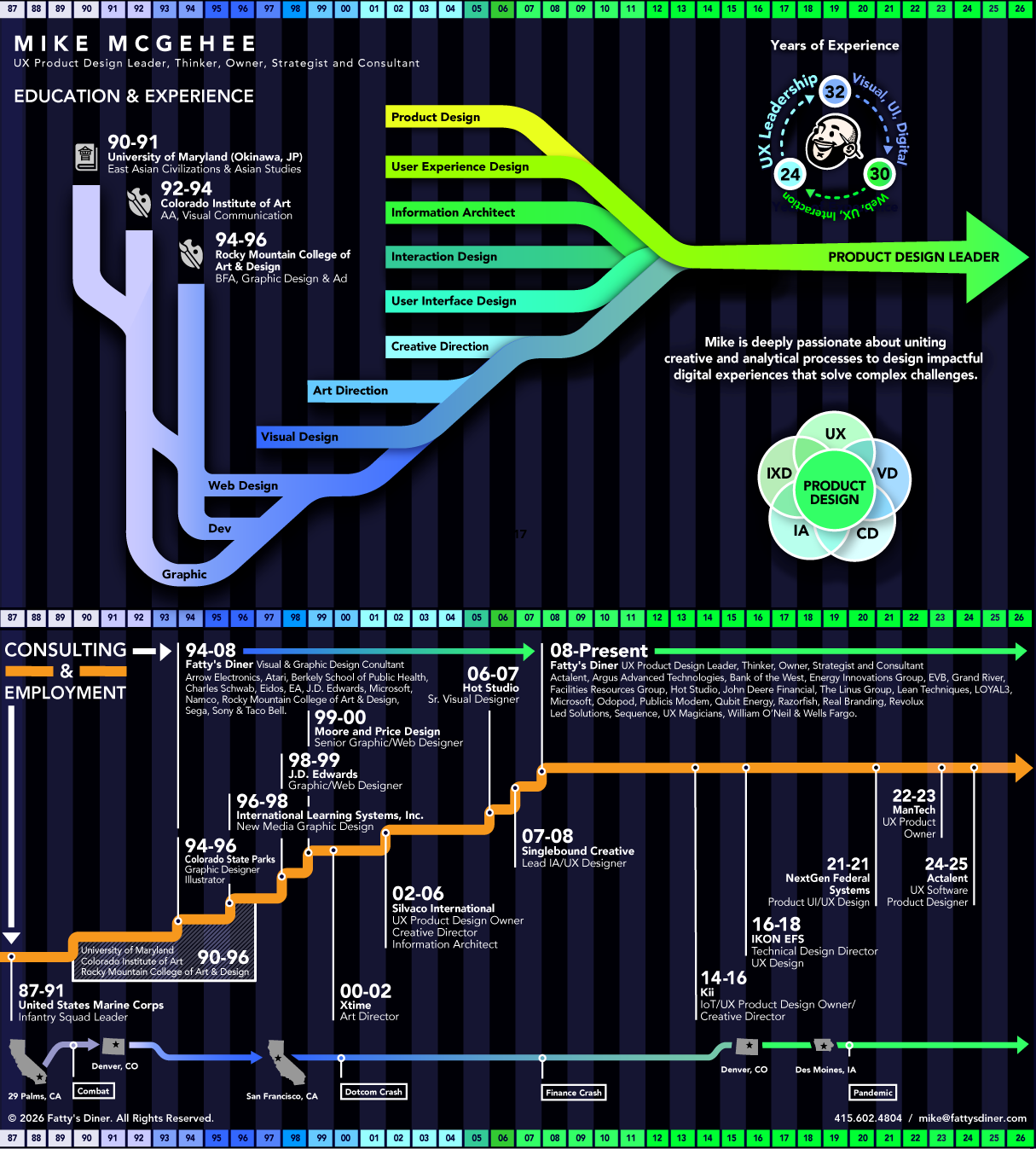 This visually engaging infographic timeline tells Mike’s story—from education to experience to career milestones—in a dynamic, easy-to-follow format.